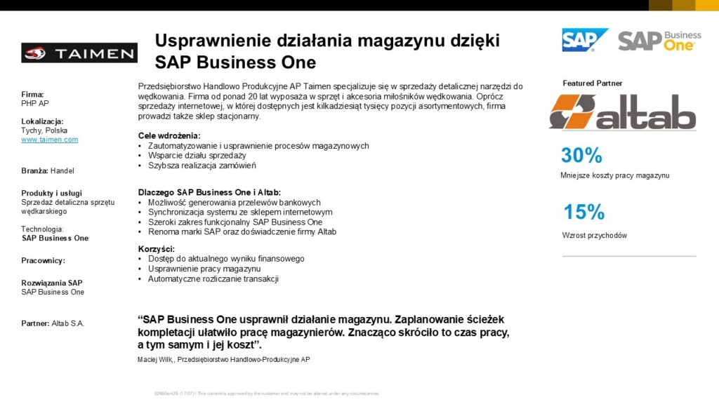 “SAP Business One usprawnił działanie magazynu. Zaplanowanie ścieżek kompletacji ułatwiło pracę magazynierów. Znacząco skróciło to czas pracy, a tym samym i jej koszt” – Maciej Wilk, Przedsiębiorstwo Handlowo-Produkcyjne AP