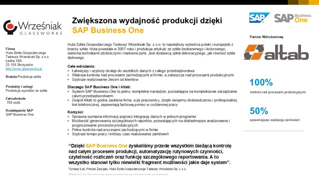 „Dzięki SAP Business One zyskaliśmy przede wszystkim bieżącą kontrolę nad całym procesem produkcji, automatyzację rutynowych czynności, czytelność rozliczeń oraz funkcję szczegółowego raportowania. A to wszystko stanowi tylko niewielki fragment możliwości jakie daje system”.