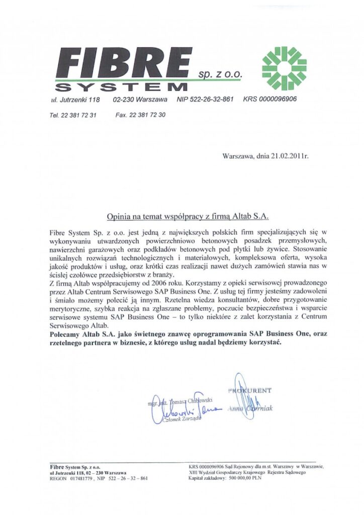 „Polecamy Altab jako świetnego znawcę oprogramowania SAP Business One, oraz rzetelnego partnera w biznesie”.