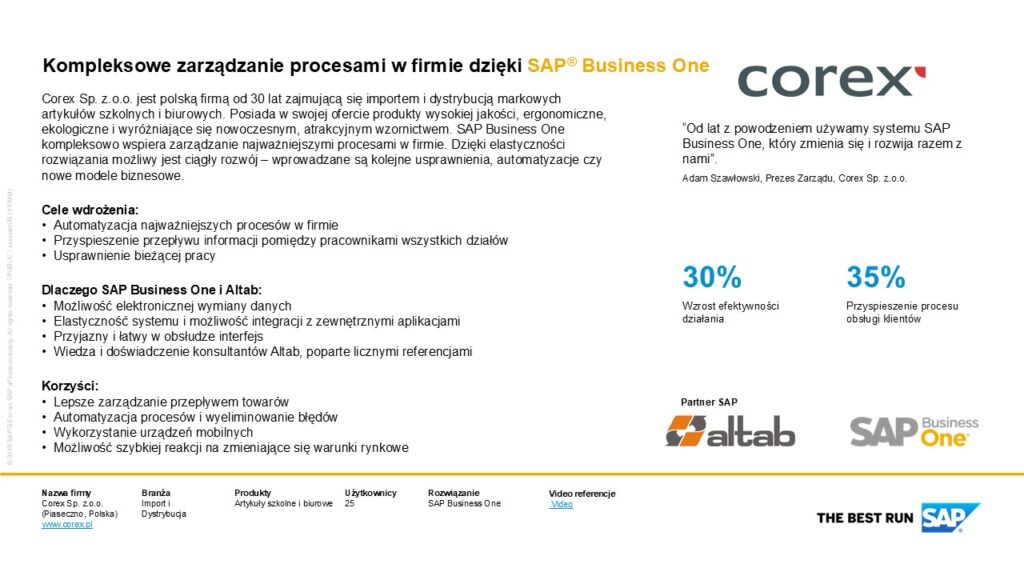 SAP Business One kompleksowo wspiera zarządzanie najważniejszymi procesami w firmie Corex. Dzięki elastyczności rozwiązania, możliwy jest ciągły rozwój firmy – wprowadzane są kolejne usprawnienia, automatyzacje oraz nowe modele biznesowe.