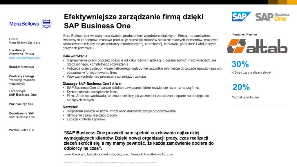„SAP Business One pozwolił nam spełnić oczekiwania najbardziej wymagających klientów. Dzięki nowej organizacji pracy, czas realizacji zleceń skrócił się, a my mamy pewność, że każde zamówienie dociera do odbiorcy na czas” – Jacek Kowalczyk, Specjalista Konstruktor, decyduje o finansach, Mera Bellows Sp. z.o.o.