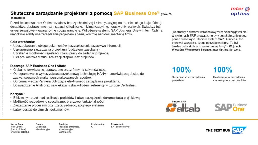 Dzięki SAP Business One, Inter-Optima – firma z branży klimatyzacji, wentylacji oraz chłodnictwa, usprawniła zarządzanie i uporządkowała procesy; przyspieszyła przepływ informacji oraz uzyskała pełną kontrolę nad realizacją projektów. Przedsiębiorstwo po wdrożeniu jednego, spójnego systemu SAP jest przygotowane na przetwarzanie większej ilości dokumentów w firmie, rozbudowując system o nowe funkcjonalności skracające prace przy dokumentach.