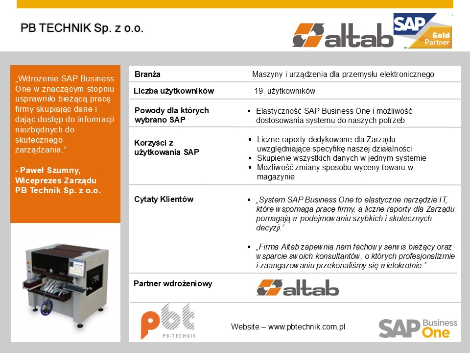 „Wdrożenie SAP Business One w znaczącym stopniu usprawniło bieżąco pracę firmy skupiając dane i dając dostęp do informacji niezbędnych do skutecznego zarządzania”.