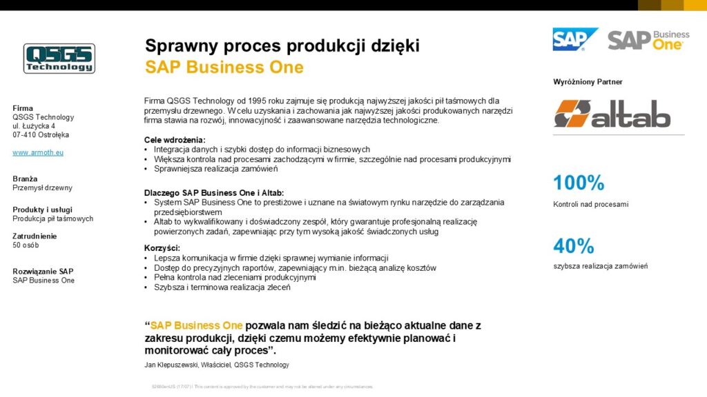 „System SAP Business One pozwala nam śledzić na bieżąco aktualne dane z zakresu produkcji, dzięki czemu możemy efektywnie planować i monitorować cały proces”.