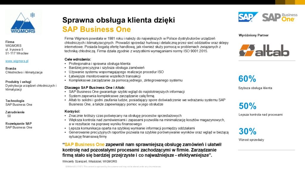 „System SAP Business One zapewnił nam sprawniejszą obsługę zamówień i ułatwił kontrolę nad pozostałymi procesami zachodzącymi w firmie. Zarządzanie firmą stało się bardziej przejrzyste i co najważniejsze – efektywniejsze”.