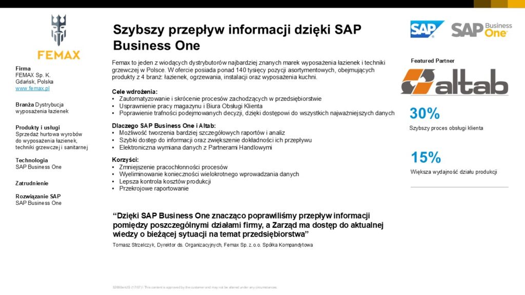 Dzięki wdrożeniu SAP Business One, Femax znacząco poprawił przepływ informacji pomiędzy poszczególnymi działami firmy, a Zarząd ma dostęp do aktualnych danych dotyczących bieżącej sytuacji w przedsiębiorstwie.