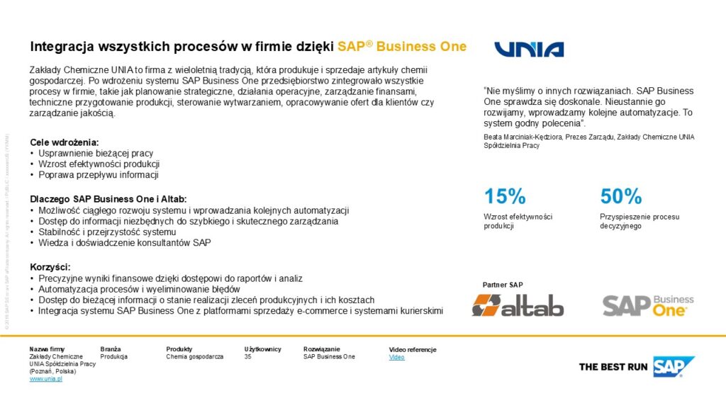 Zakłady Chemiczne Unia Spółdzielnia Pracy zautomatyzowały i przyspieszyły sprzedaż online dzięki integracji SAP Business One ze sklepem internetowym, portalem Allegro i aplikacjami firm kurierskich. Zamówienia internetowe są automatycznie rejestrowane w SAP Business One, potwierdzane i przekazywane do realizacji. Po skompletowaniu dostawy automatycznie zamawiana jest firma kurierska.