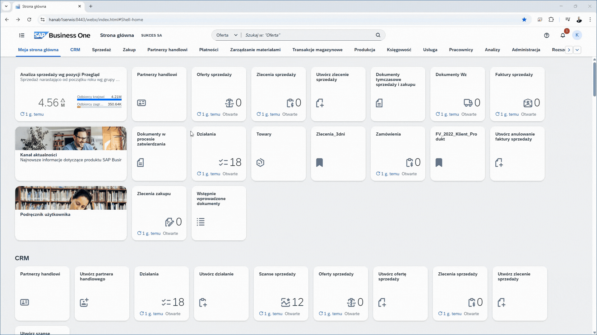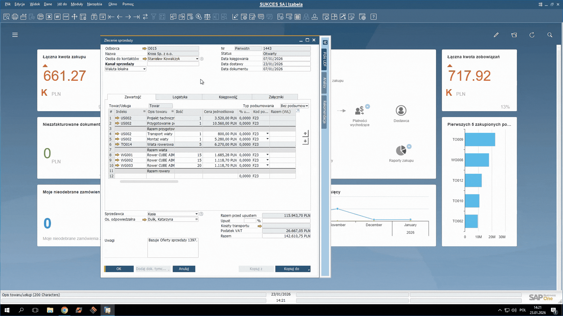 Odpowiadam za kontakt z klientami i obsługę procesu sprzedaży. Zapytania rejestruję jako szanse sprzedaży, gdzie gromadzę ustalenia, historię działań, wartość oferty i prawdopodobieństwo jej wygrania. Przygotowuję wstępne wyceny, konsultuję zakres prac z zespołem technicznym i wysyłam oferty. Po wygraniu szansy przekształcam ofertę w zlecenie sprzedaży, które stanowi podstawę uruchomienia projektu w SAP Business One, zapewniając ciągłość danych i spójny kontekst handlowo-finansowy.