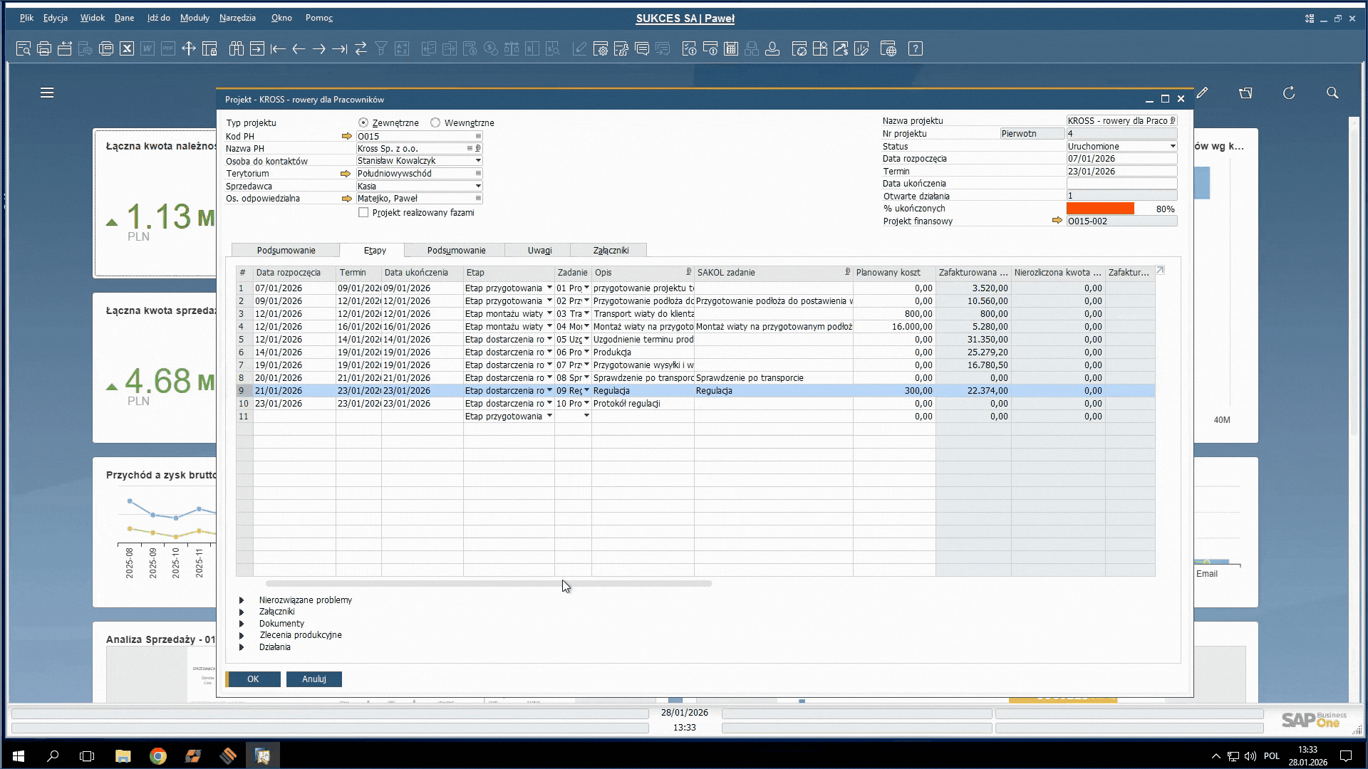 Odpowiadam za harmonogram projektu, kontrolę wydatków oraz bieżący nadzór nad postępem prac. Koordynuję codzienną pracę zespołu projektowego, przypisuję zadania do zasobów i dbam o realizację projektu zgodnie z planem. W SAP Business One definiuję etapy, zadania i budżet projektu, a następnie na bieżąco porównuję koszty planowane z rzeczywistymi. Dzięki aktualnym danym mogę szybko reagować na ryzyka i odchylenia oraz raportować postępy bezpośrednio w systemie.